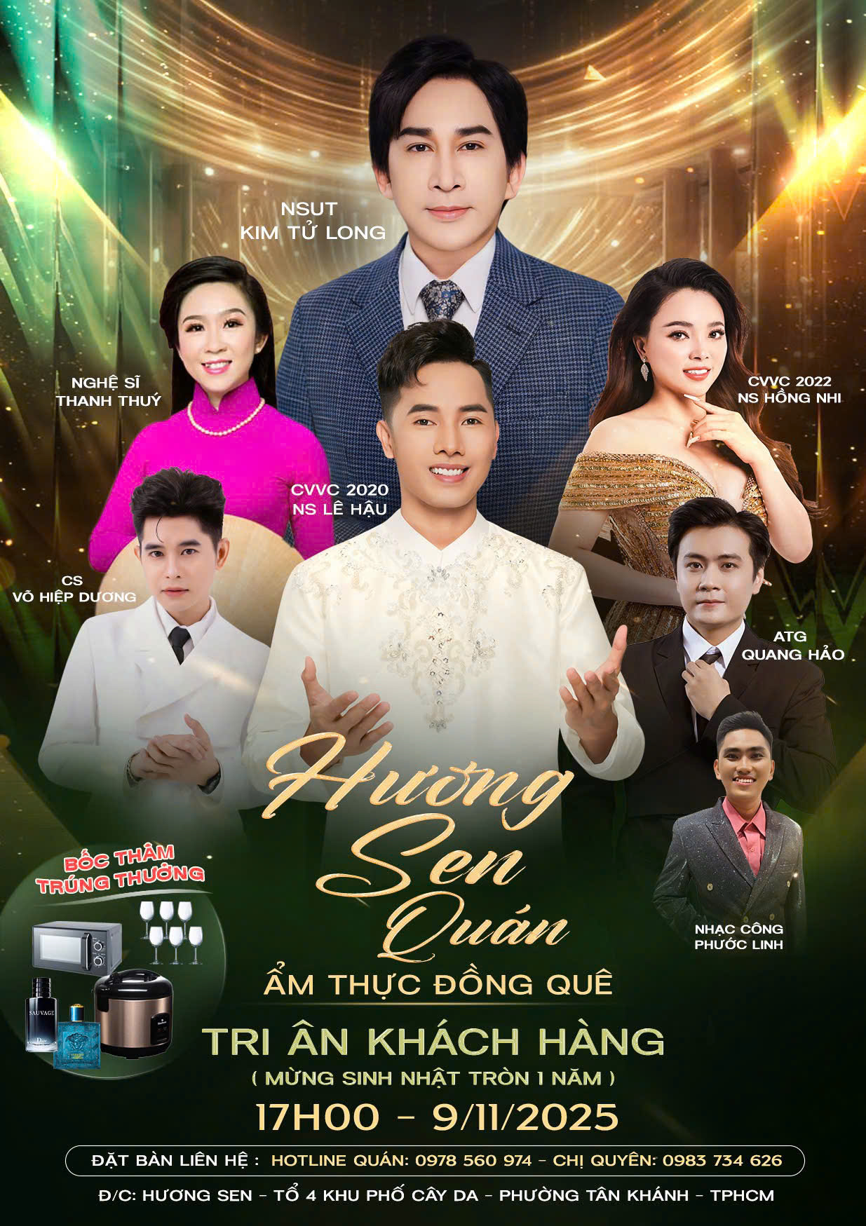 Mừng sinh nhật 1 năm nhà hàng Hương Sen quán tổ chức chương trình ẨM THỰC ĐỒNG QUÊ để tri ân khách hàng với sự góp mặt của các ca sĩ, nghệ sĩ nổi tiếng như: NSUT Kim Tử Long, Nghệ sĩ Lê Hậu, Nghệ sĩ Thanh Thúy, Nghệ sĩ Hồng Nhi,...